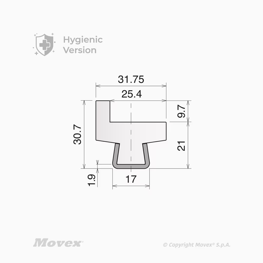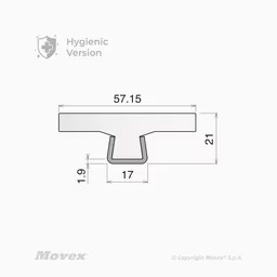 Rail code CVR1.70RIB, Base 0.67", Largeur 1.70" avec Rib, fait en UHMW blanc, support en acier inox.